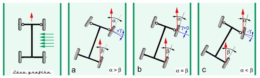 A jobb oldali ábra nagyon dúrva szakaszokban mutatja a jelenséget. A valóságban a deformáció és az előrehaladás mikroméretekben történik. Az, hogy mekkora az a szög, elsősorban az Fc oladerőtől függ, de nagy mértékben befolyásolja a tömlőben lévő nyomás is (azonos típusú abroncsokat feltételezve). Az Fc oladerő elöl és hátúl nagy mértékben különbözhet a jármű tömegközéppontjának helyétől függően. Az ábrán nyilak hosszúságával jellemzük az erők nagyságát. Ha az oldalkúszás elöl-hátul egyforma (fekete nyilak), akkor a kanyarulati sugár (ro) megegyezik a kerekek bekormányozottságához tartozó sugárral. Ha elöl nagyobb az oldalkúszás, mint hátul (zöld nyilak), akkor a jármű az elméletileg számított sugárnál nagyobb ívben halad (alulkormányzott). Ha fordítva, elöl kisebb, hátul nagyobb a kúszás (piros nyilak), akkor élesebb kanyarba fordul a jármű.